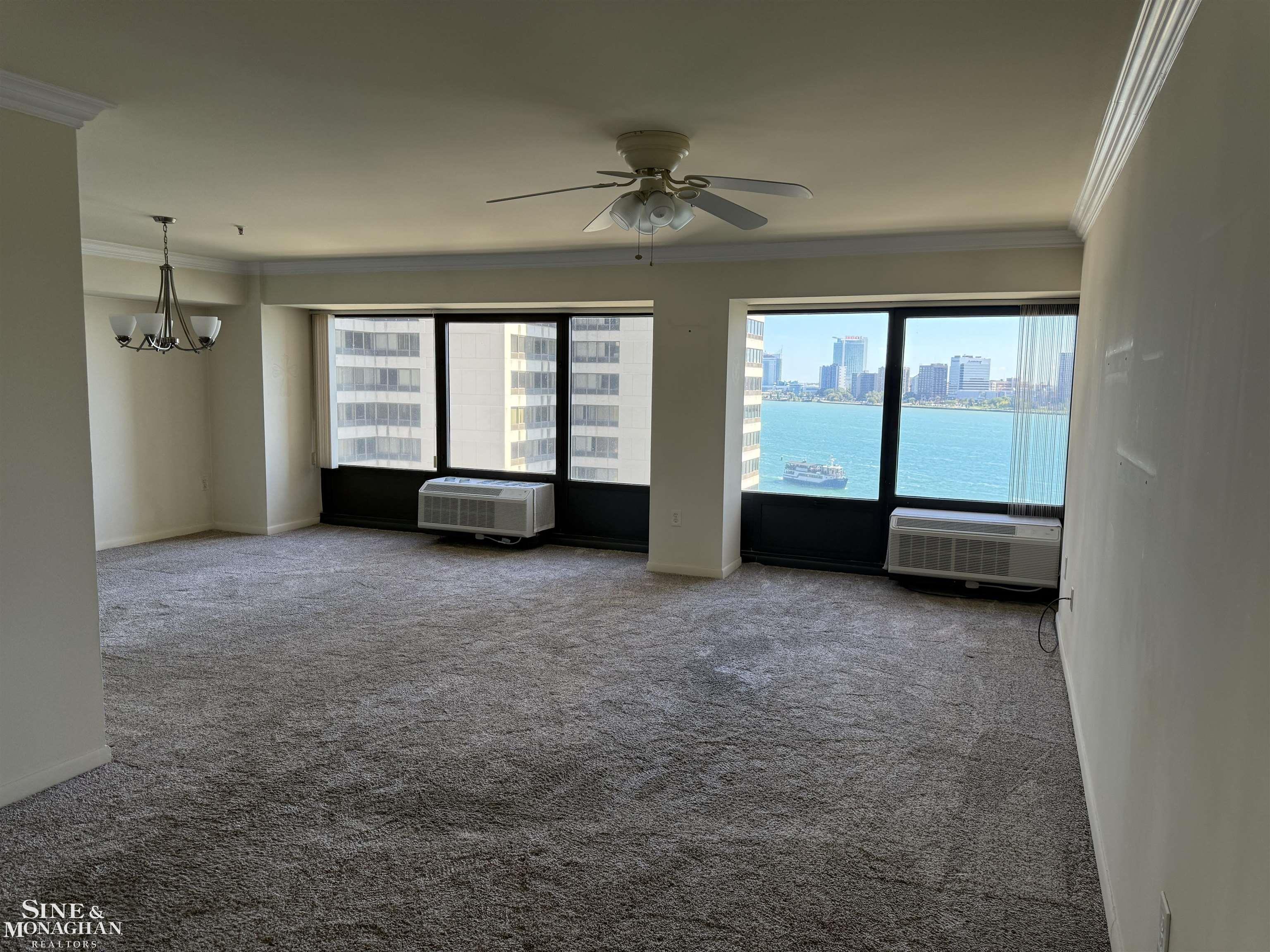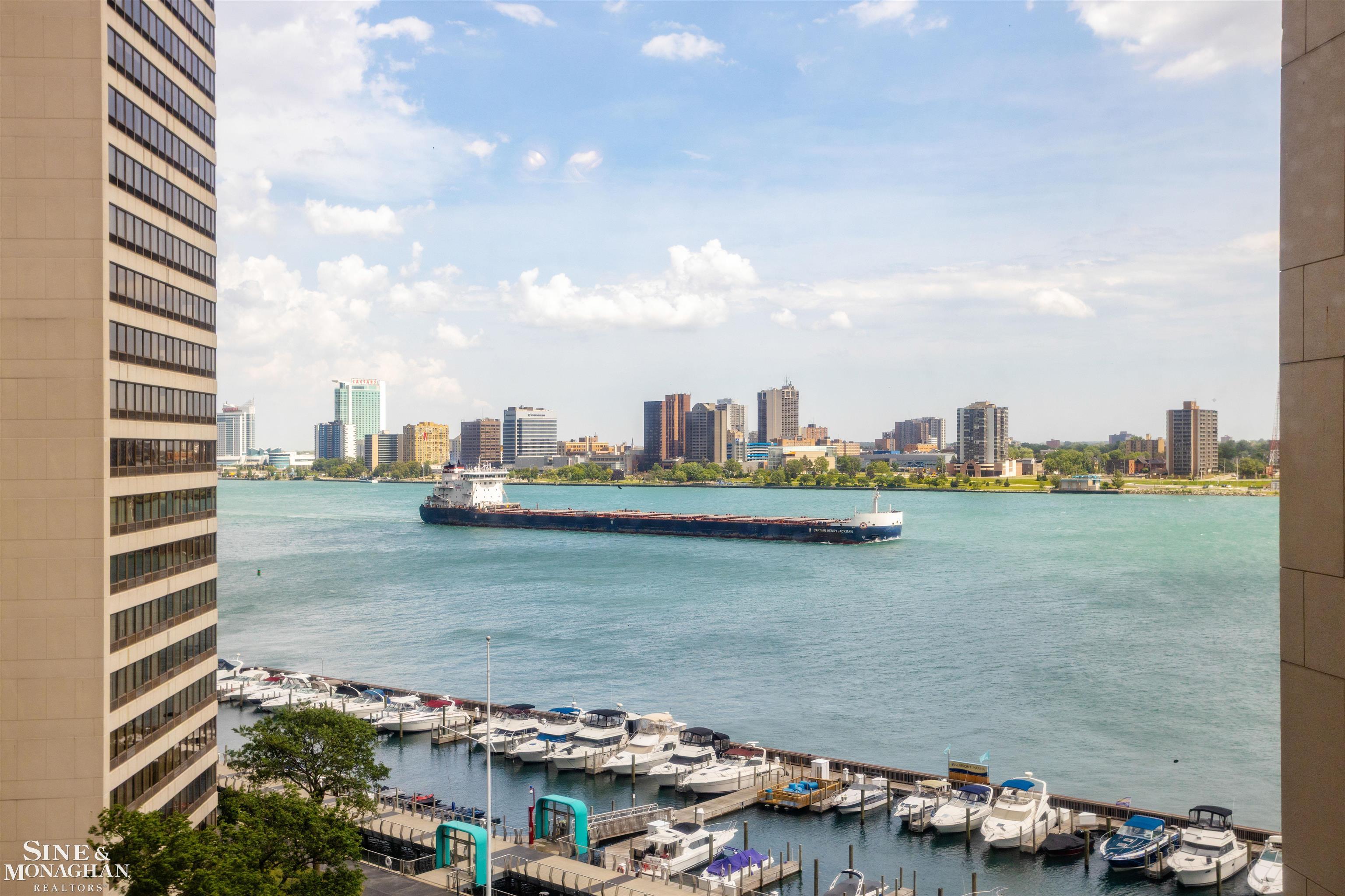 Soak in the views from this waterfront condo. Wake every morning to watch the sunrise over the water. Watch the fireworks or the Air and Boat Show from your own private, unobstructed vantage point 10 stories high. Tons of natural light from the floor-to-ceiling windows provide bright and cheery living. This unit features 2 bedrooms, 2 full baths, a well-appointed kitchen, roomy living and dining space, and an in-unit washer/dryer! This Riverfront condo is part of a 24-hour gated community. There is access to a fitness center, indoor heated pool, sauna & spa, tennis and volleyball courts, a jogging track, dog run, market, dry cleaners, and a salon. In addition, the River-Walk runs right in front of the building, along with picnic, grilling, and fire pit areas that are all surrounded by beautifully maintained grounds. There is also a Skywalk to the people mover, providing easy access to all that Detroit has to offer. See the attached article about the new Ralph C. Wilson Centennial Park opening this October right next door!