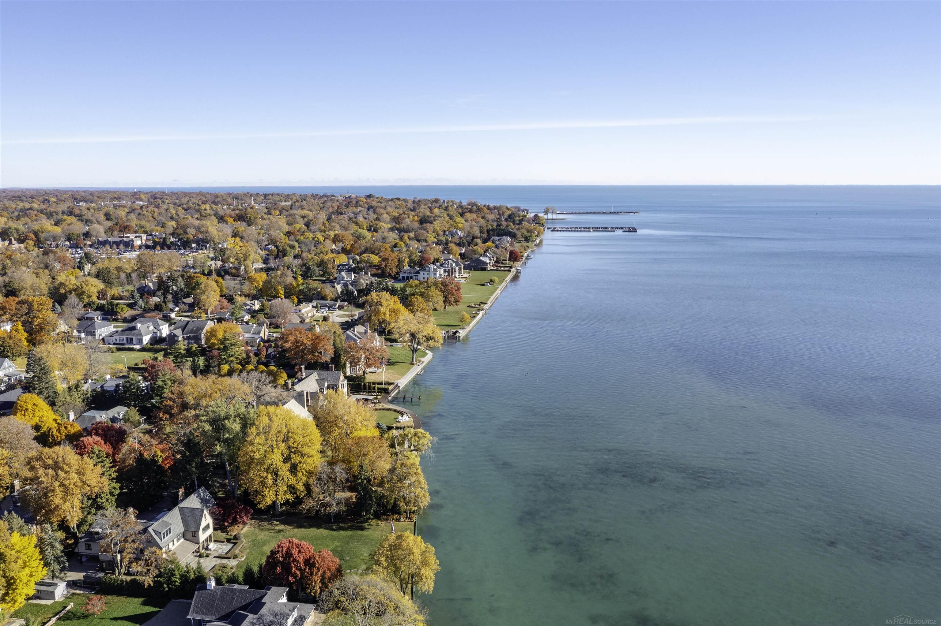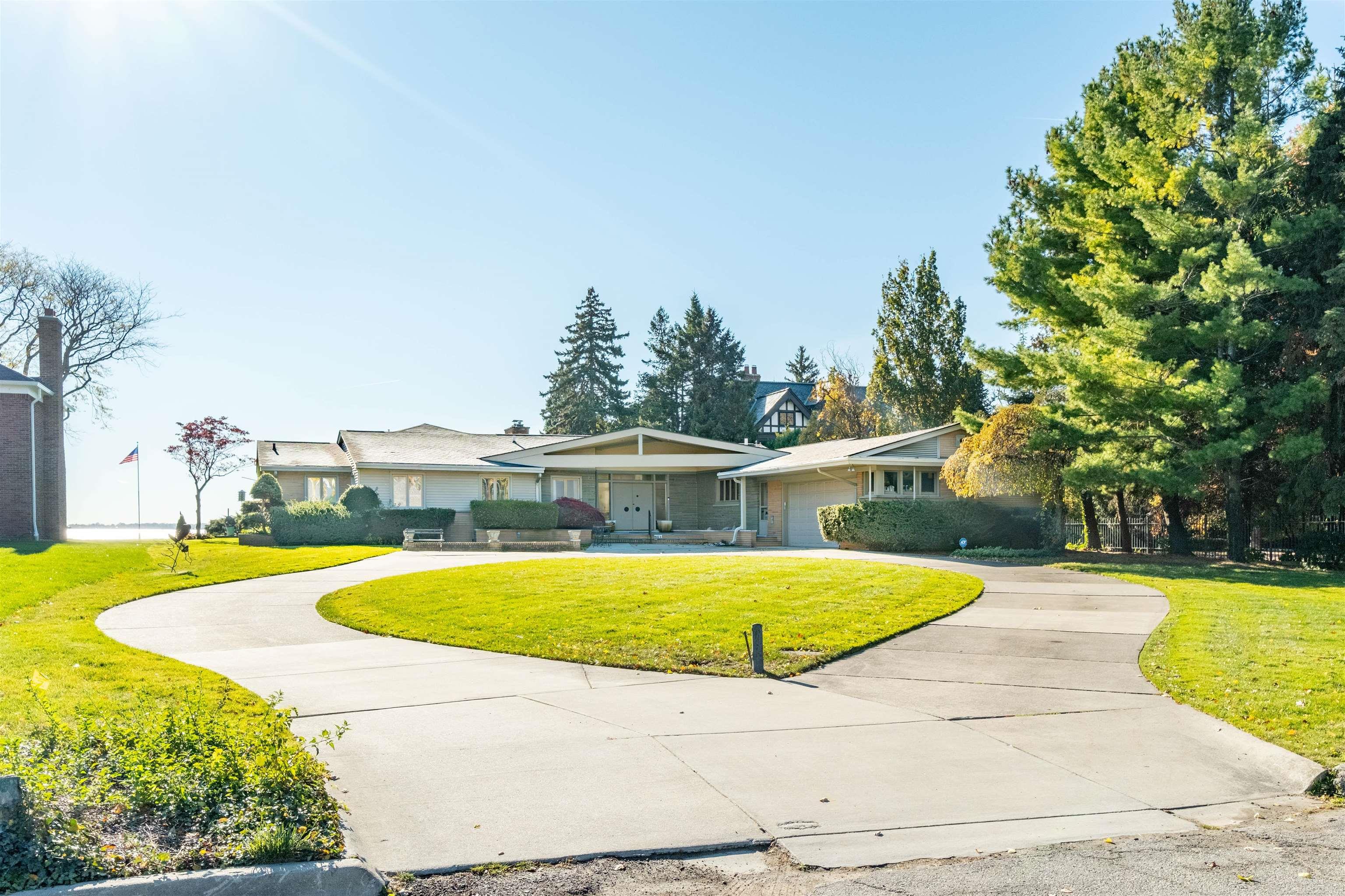 This sprawling mid-century ranch is located at the end of a secluded Lane on beautiful Lake St. Clair. This is currently THE ONLY waterfront property that is for sale throughout the entire Grosse Pointe's. 144' of lake frontage. The lot is over 3/4 of an acre (see survey) The home features a 500 sq ft Great Room with floor to ceiling windows, soaring vaulted ceiling and stunning lake views with priceless sunrises. The primary suite offers lake views, full bath with powder room and impressive closet space. The roomy eat-in kitchen has built-in appliances with an abundance of cabinetry. There is a lovely formal dining room. The 25'X18' living room with NFP (gas logs) connects to the Great Room. This floor plan has splendid flow for hosting intimate or large gatherings. The library/study has built-in bookshelves and cabinetry. The travertine marble floored foyer is spacious and inviting. The wing off the kitchen consists of a laundry room (washer and dryer included) and a long wall of closets and cabinets. The very private guest bedroom has its own full bath. The basement consists of a home office with many built in bookshelves. There is a lavatory, a workshop and a utility/mechanical room and great storage. Double zoned HVAC, whole house generator, 2.5 car attached garage and an impressive circular drive-way. The new 144 ft. concrete walkway (with boat hoist) runs alongside the entire seawall. There is a koi pond with a waterfall surrounded by a wooden sun deck. GPP has 2 residents' only waterfront parks with pools, Marina, tennis, pickle ball, 2 movie theatres and much more! Less than a 20-minute ride to Downtown Detroit's business district, entertainment and sports venues. Immediate occupancy! This house is being sold in "AS IS" condition with the purchaser(s) being responsible for obtaining a City of GPP Certificate of Occupancy. Showings begin 11-28-25